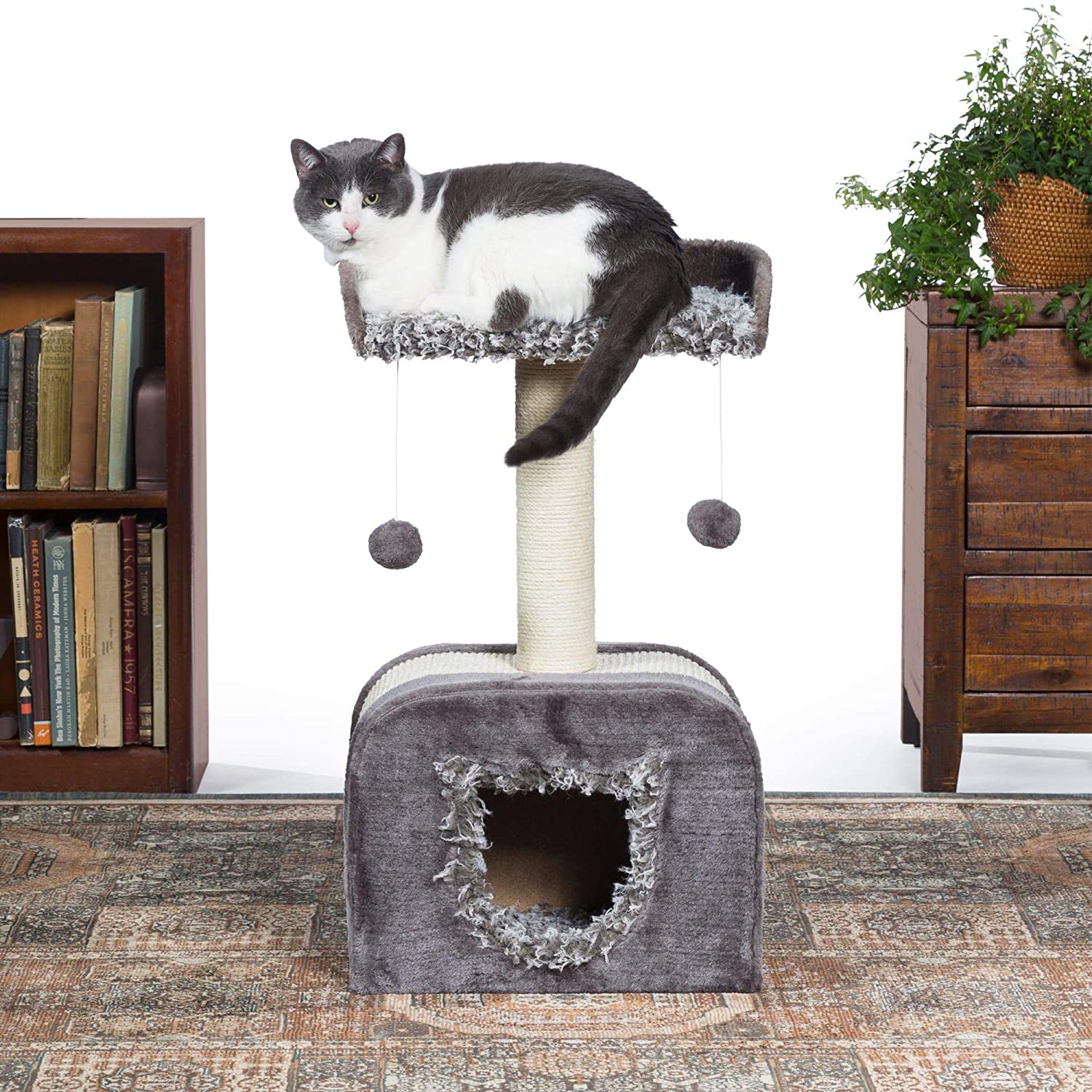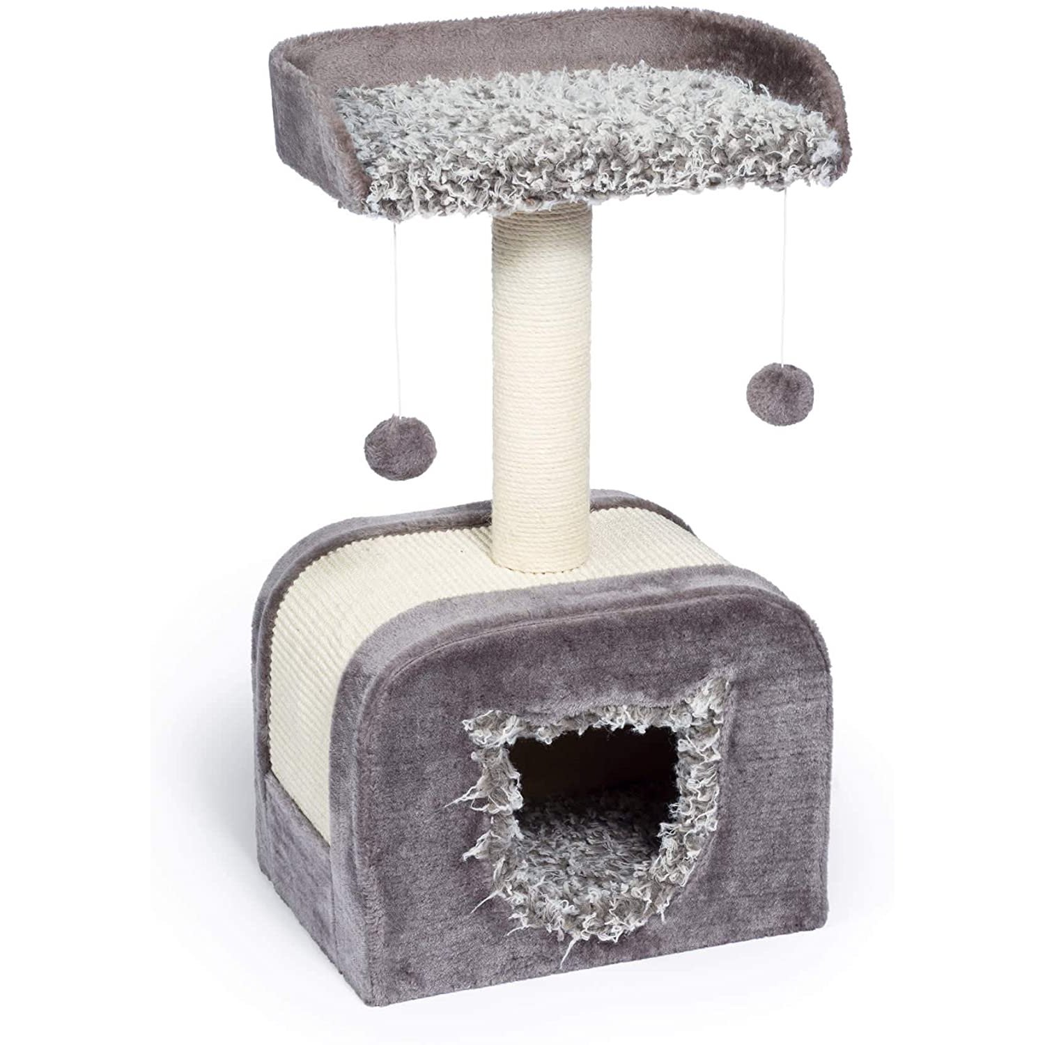 • Two plush, dangling, swat toys hang playfully from the cat bed encouraging kitty to play
