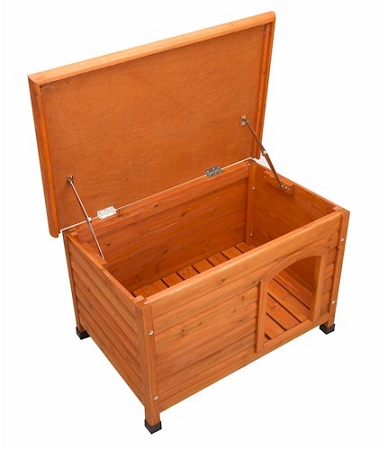 This durable dog house has everything you and your pet could ask for. It is made from fir wood and sealed with a water based non-toxic stain. This dog house is very easy and quick to assemble in just minutes with only a screwdriver needed! It has a full opening roof for easy access and cleaning. This dog house also has height adjustable feet so your dog's home will never be unlevel.